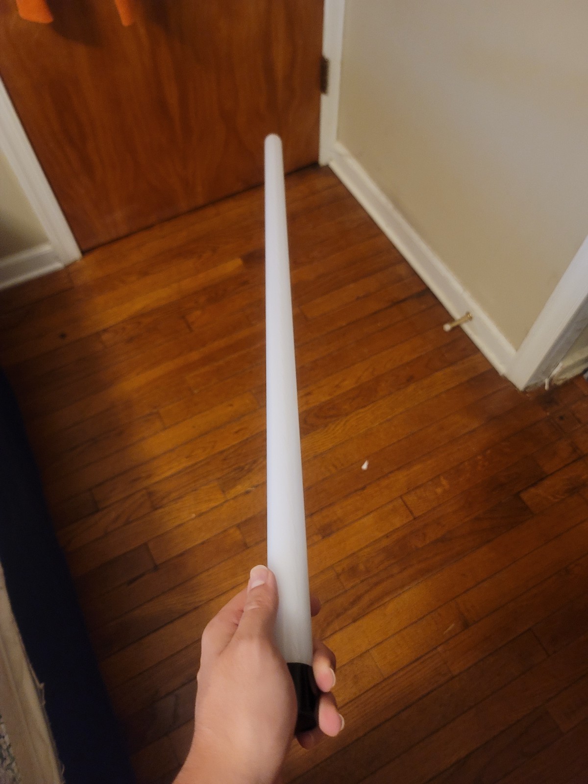 A brand new and unused Lightsaber from Theory Sabers. Comes with an electronic handle/hilt and a 32 inch blade that can be screwed in, as well as a bag of screws, a wench to screw the blade in, a handle plug for when the blade is not inserted, and a charging cable. The handle itself is about 10 inches long without the blade attached.